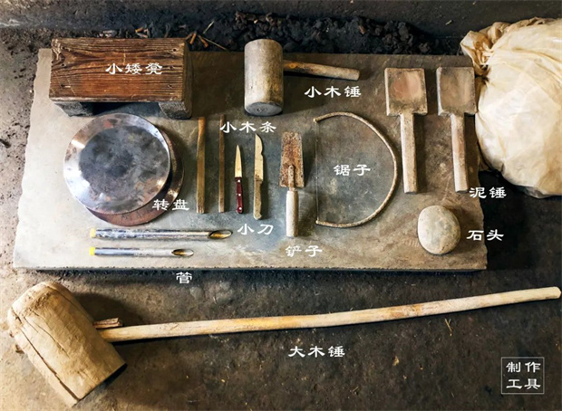 1. 選泥與打泥:制作土鍋子首先選用粘性較好的膠泥,加入細(xì)沙和水?dāng)嚢?,然后用石錘使勁錘打,此為“打泥”,打好的泥